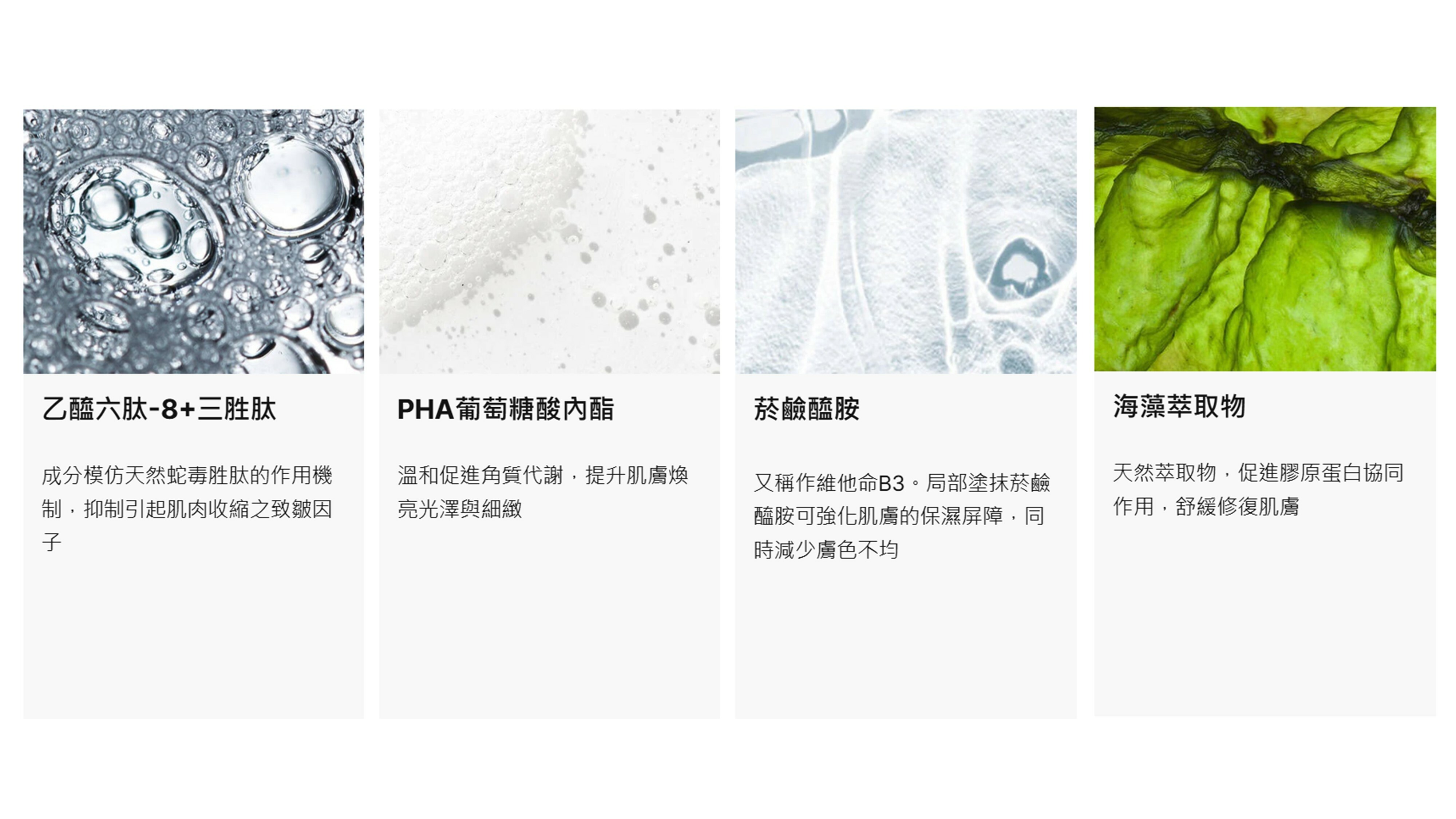 P-TIOX 超胜肽抗皺極光精華,研發新一代先進胜肽配方,對抗深層紋,調節神經傳導物質及肌肉收縮因子,臨床實驗證實有效淡化九大深層紋路,一週實現煥亮肌。
